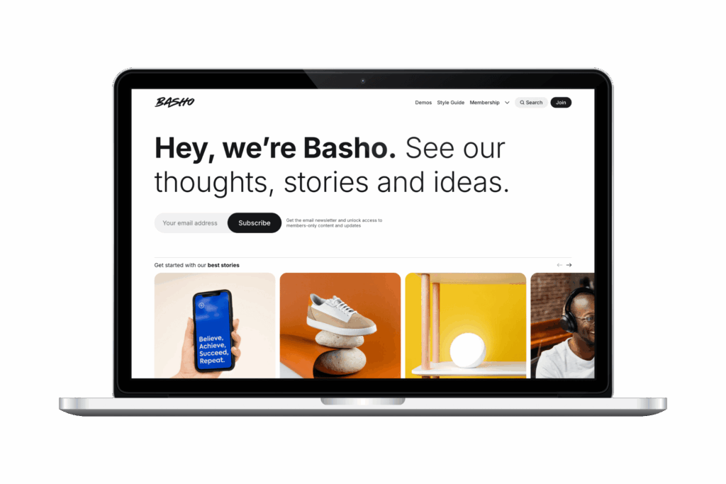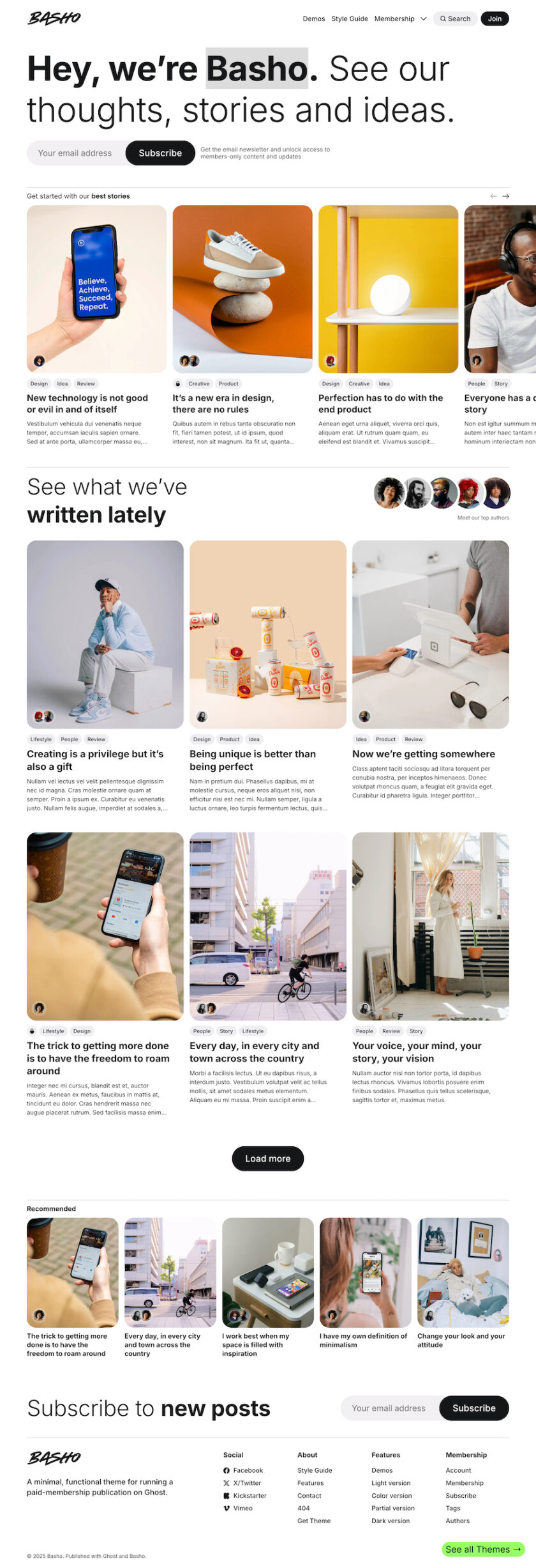 - Versatile Layouts & Native Power: Multiple demos (view at fueko.net/themes/basho); full Ghost 6.x support with clean, minimal design; customizable hero sections (subscription forms/buttons, sliders for 15+ posts in small/large sizes), 3 post header layouts, image orientations (portrait/landscape/square/natural), and card types (Markdown, galleries, videos in normal/wide/full widths).
