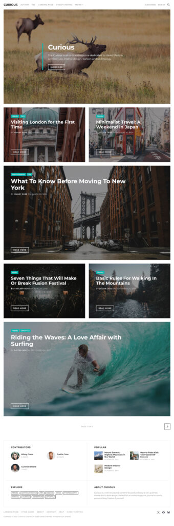 Curious delivers a clean, bold, and content-focused experience for Ghost-powered magazines, journals, and personal blogs, blending modern typography with effortless setup. This lightweight theme excels in readability and speed, harnessing native Ghost features for memberships, subscriptions, and SEO optimization—complete with dark/light modes, widget-rich sidebars, and translation readiness for a polished, responsive site that’s easy to customize without code.