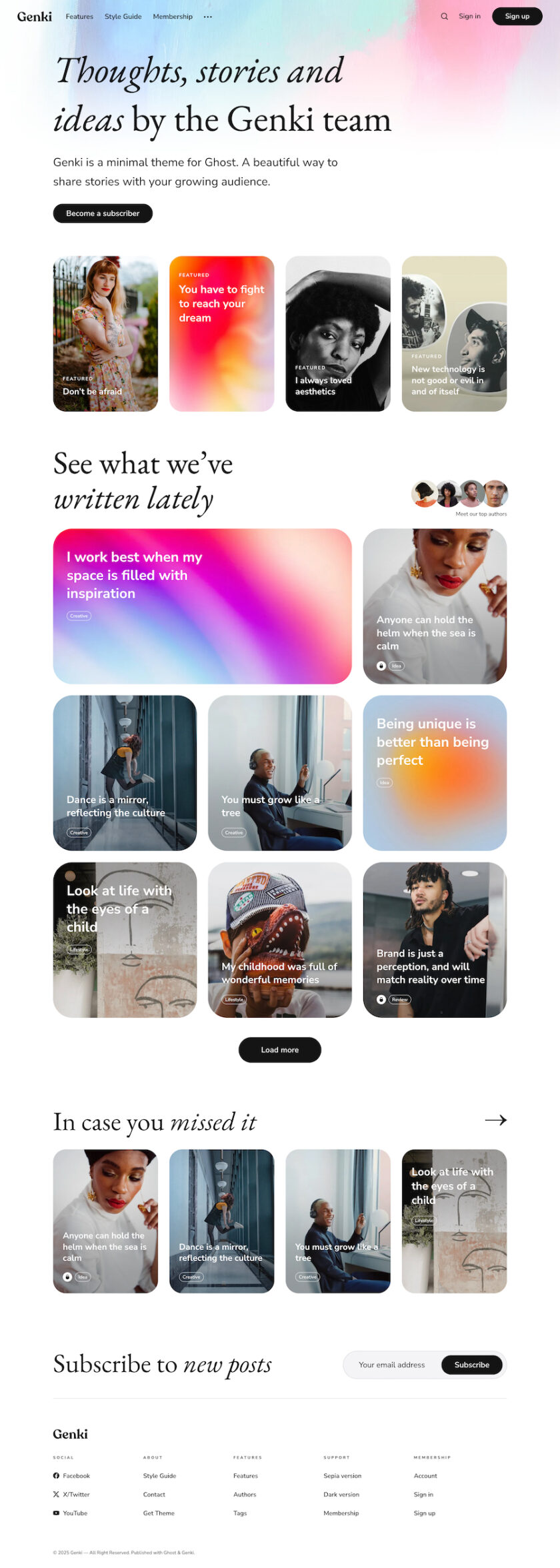 Genki energizes Ghost blogging with a vibrant, magazine-style aesthetic that’s lightweight and infinitely tweakable, ideal for news sites, personal journals, and creative portfolios. This responsive gem harnesses Ghost’s core for memberships, newsletters, and SEO supremacy, featuring multiple layouts, automatic dark/light modes, and effortless customizations like tag-based sections and social feeds—all in a translation-ready, high-speed package with Disqus comments and Stripe support for monetization.